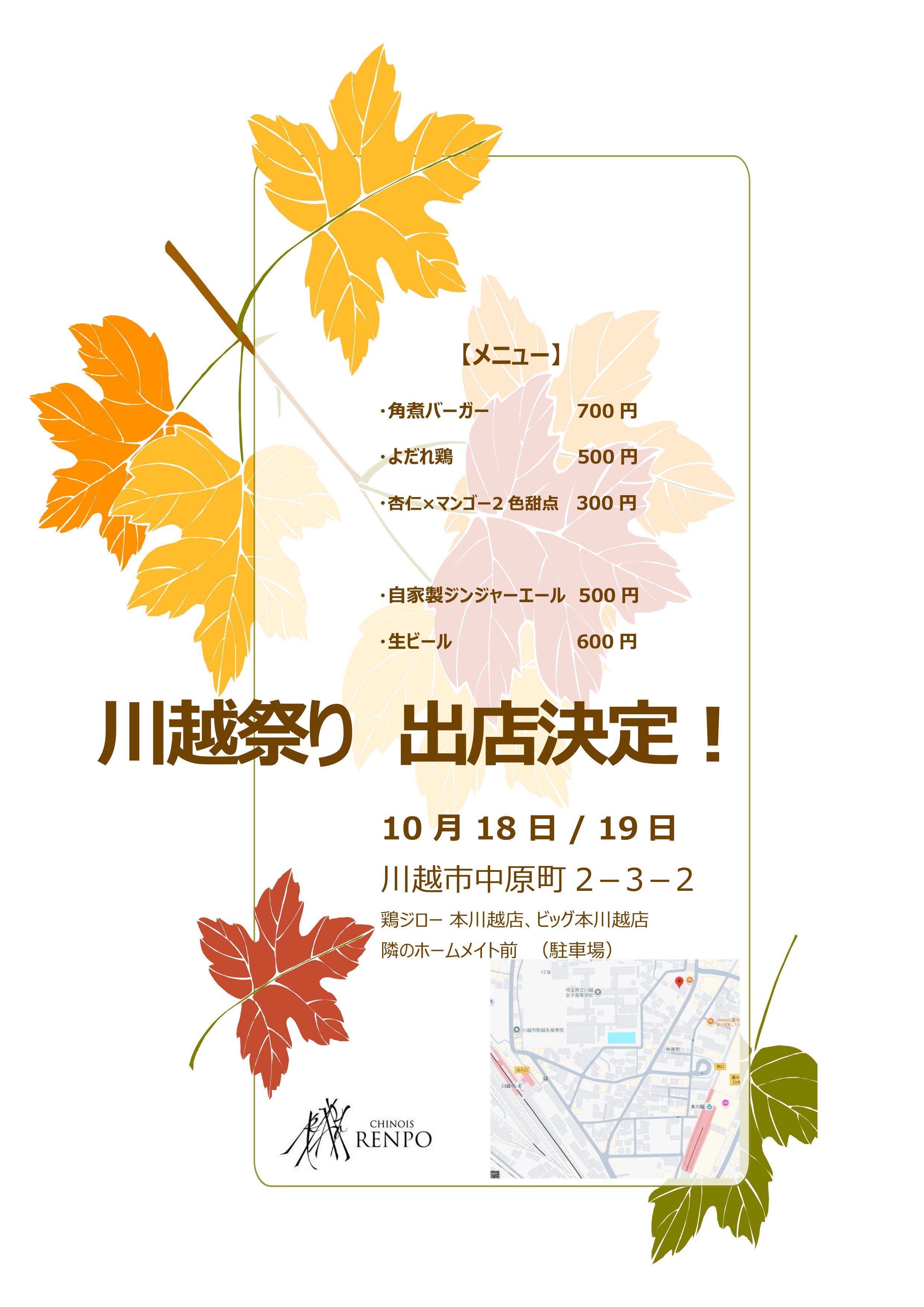 10月18日(土)19日(日)に開催される川越祭りchinois蓮歩の屋台が出店決定しました!