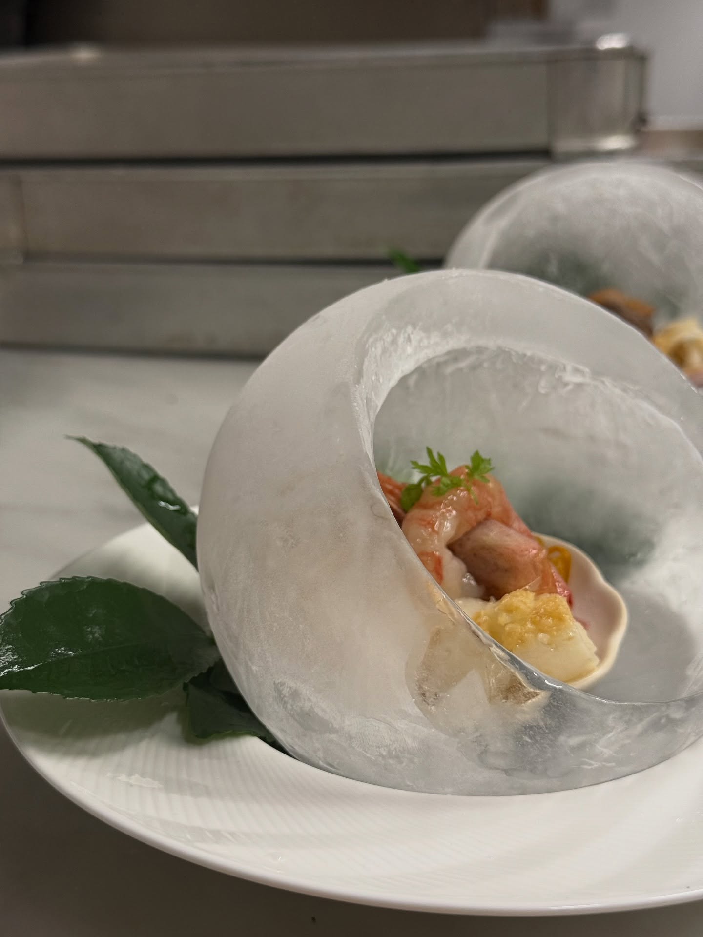 かまくらのような可愛らしい氷の器に入れた前菜。