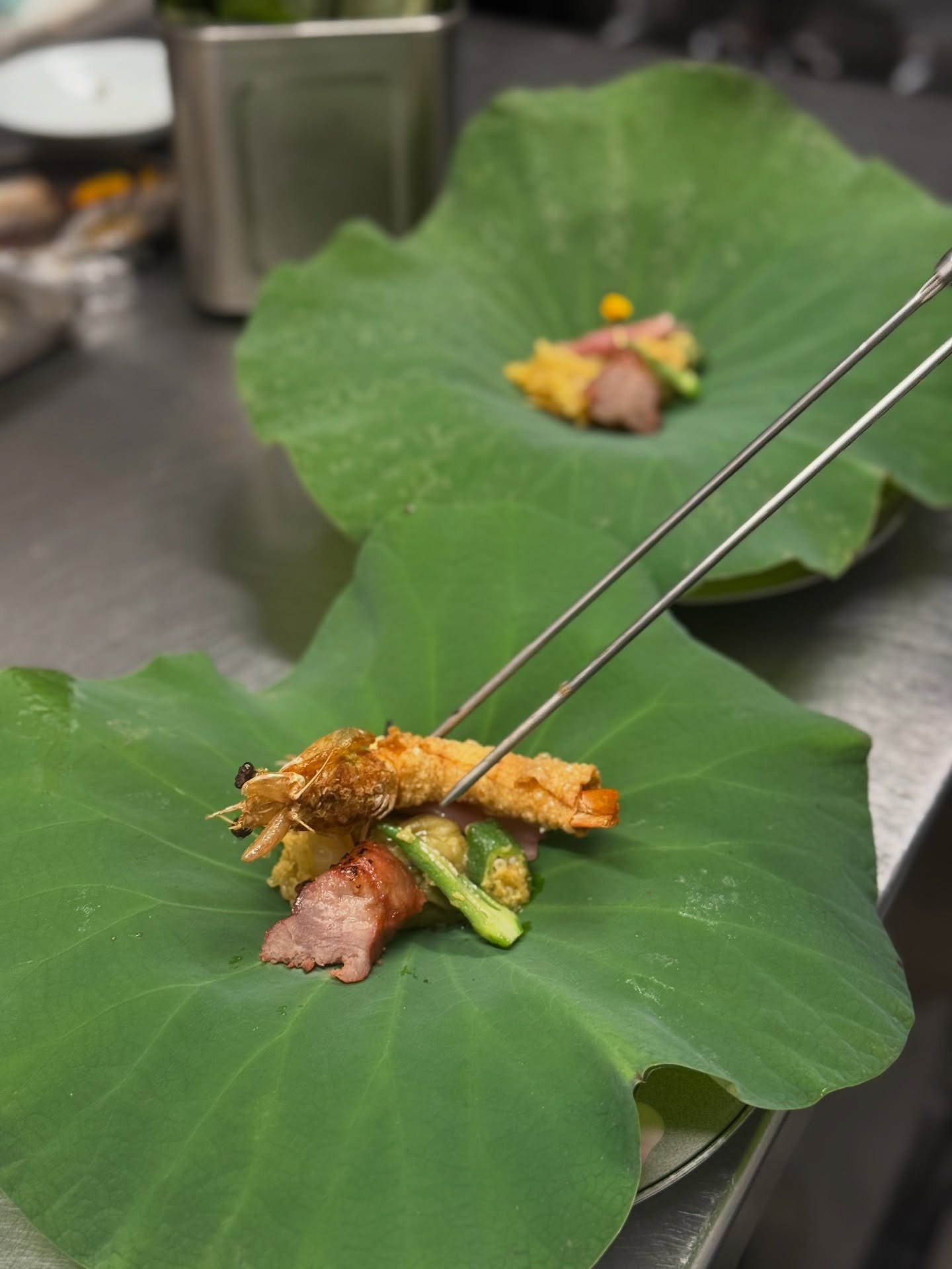海老の湯葉巻揚げやお野菜達を蓮の葉に乗せた前菜です。