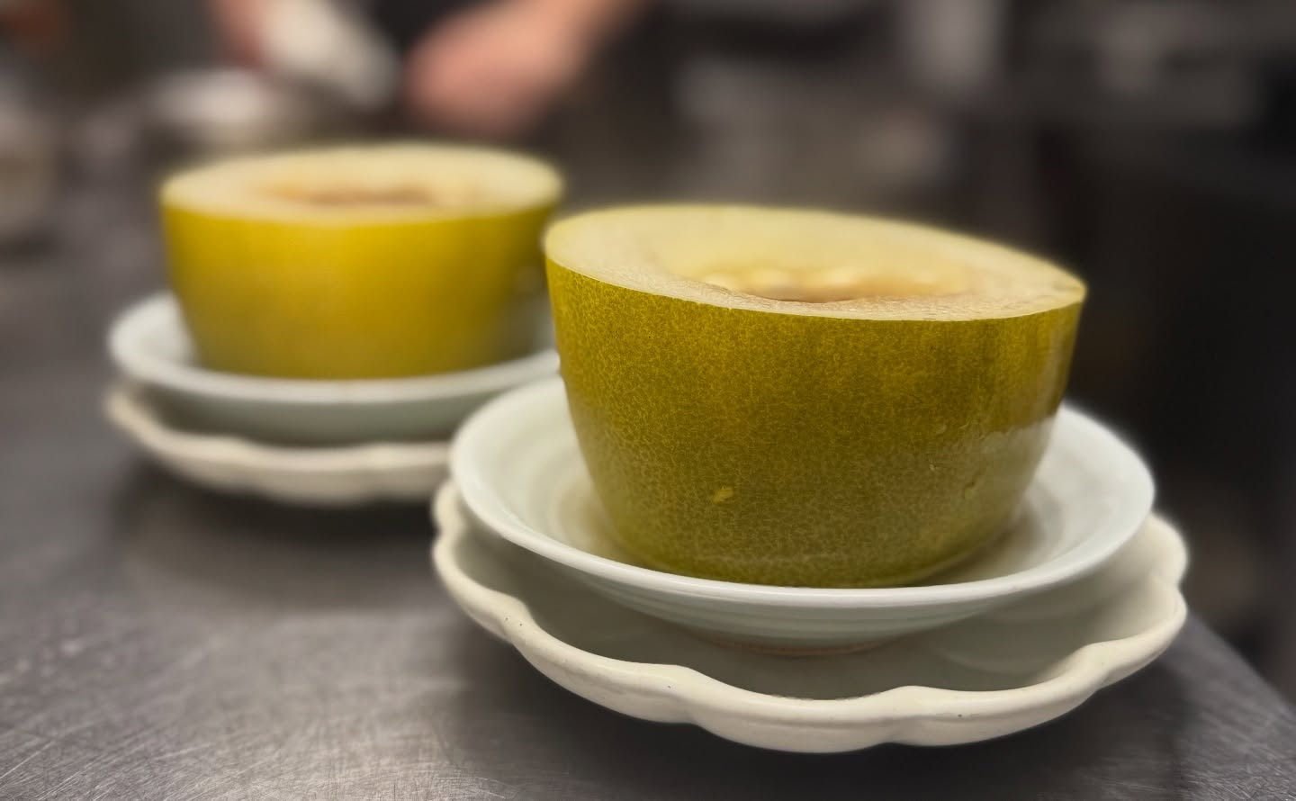 冬瓜の中身をくり抜き器に見立てた迫力のある一品です。