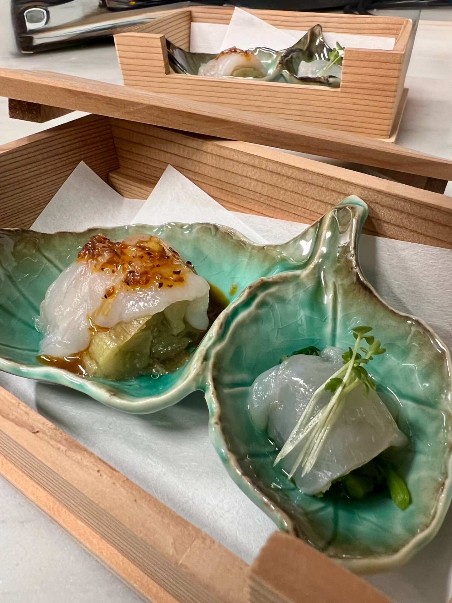 北海道から届いた旬の桜マス。短時間蒸して火を入れ、しっとりとレアに仕上げた桜マスは口に入れた途端に優しく溶ろけていく何とも言えない食感です。